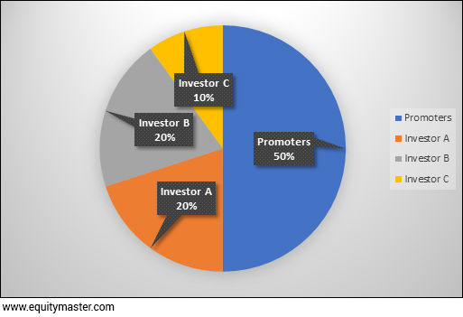 The total number of shares issued of a company increases but the number of shares held by the initial investors remain the same. Thus, their equity holding in the company reduces in percentage terms.