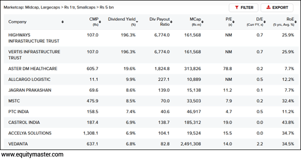 These stocks are selected using Equitymaster's Screener - High Dividend Yield Stocks in India. We have chosen names from across market-cap categories.
