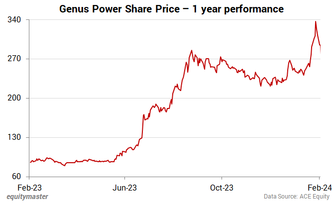 Genus Power has a 52-week high of Rs 344 touched on 8 February 2024 and a 52-week low of Rs 79 touched on 28 March 2023.