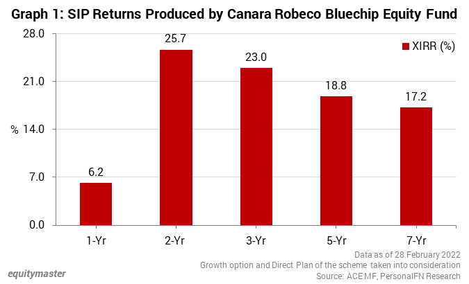 A Rs 5,000 monthly SIP in Canara Robeco Bluechip Equity Fund at an appealing 23.0% XIRR in three years, grew to about Rs 2.61 lakh as of 28 February 2022.