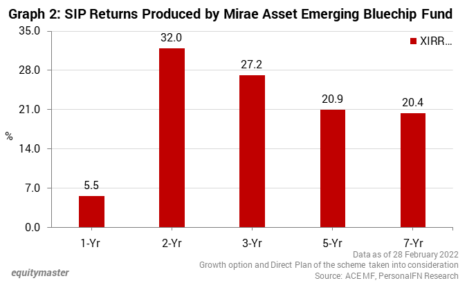A Rs 5,000 monthly SIP in Mirae Asset Emerging Bluechip at remarkable 27.2% XIRR in three years, grew to Rs 2.80 lakh as of 28 February 2022.
