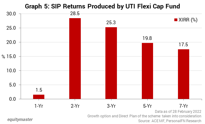 A Rs 5,000 monthly SIP in UTI Flexi Cap Fund at appealing 25.3% XIRR in three years, grew to about Rs 2.71 lakh as of 28 February 2022.
