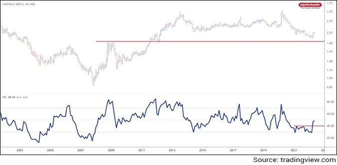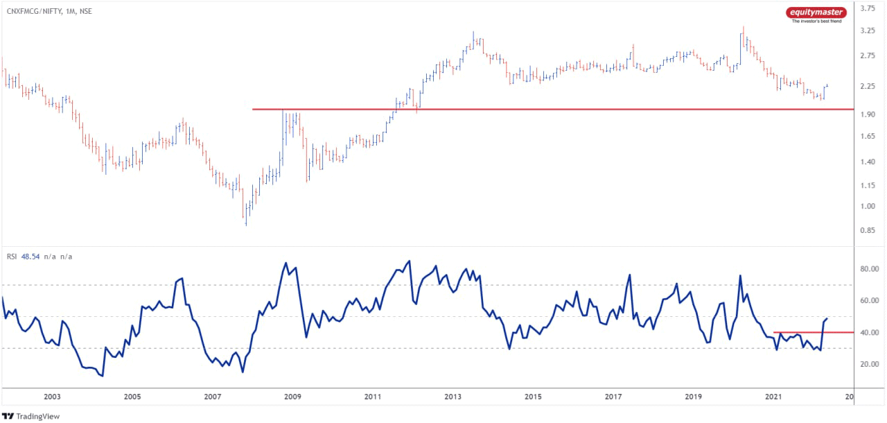 The chart above is the ratio chart of FMCG index to Nifty. Ratio charts are used to identify the performance of one security over another. If the ratio goes higher, the FMCG index will likely outperform Nifty and vice versa.