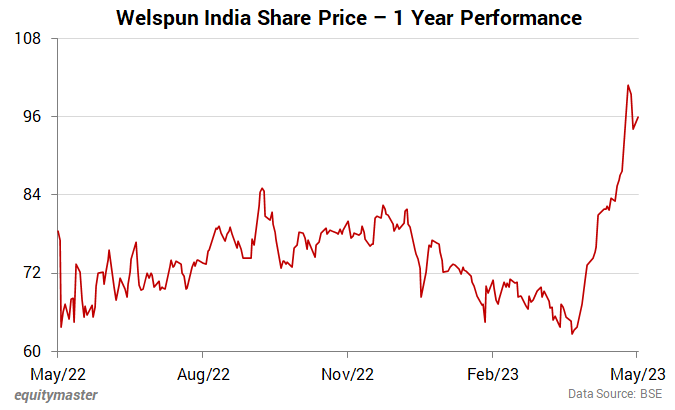 Welspun India touched a 52-week high of Rs 104.9 on 5 May 2023 and a 52-week low of Rs 30 on 29 March 2023.