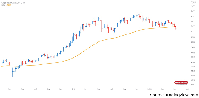 Technically, the total marketcap of crypto has moved below the 100WEMA (Weekly Exponential Moving Average) for the first time after April 2020.