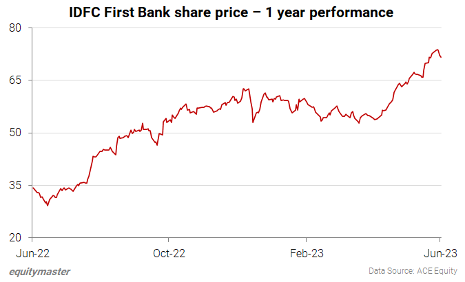 Shares of IDFC First Bank currently trade at Rs 71.6, a tad lower from their 52-week high price of Rs 74 touched on 7 June 2023.