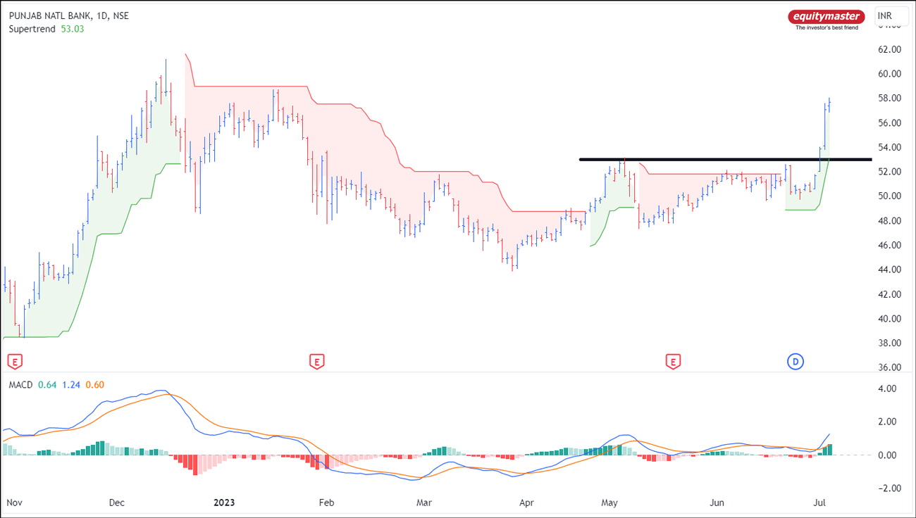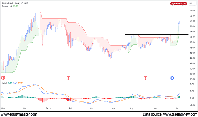 While PNB has recently shown a breakout on the daily chart, supported by the bullish super trend indicator and positive MACD crossover, its underperformance in comparison to private banks raises concerns.