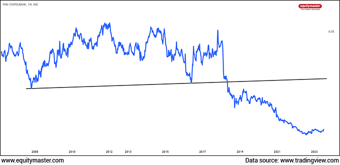 The analysis of the ratio chart reveals that the bullish momentum in PNB has not been sustained since 2018 since its trendline breakdown. Instead, it tends to fizzle out, leading to underperformance compared to the PSU Bank Index.