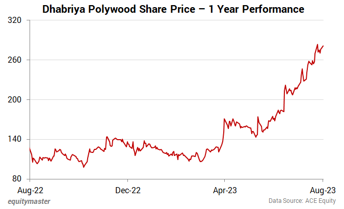 Dhabriya Polywood has a 52-week high of Rs 297 touched on 8 August 2023 and a 52-week low of Rs 87.7 touched on 20 October 2022.