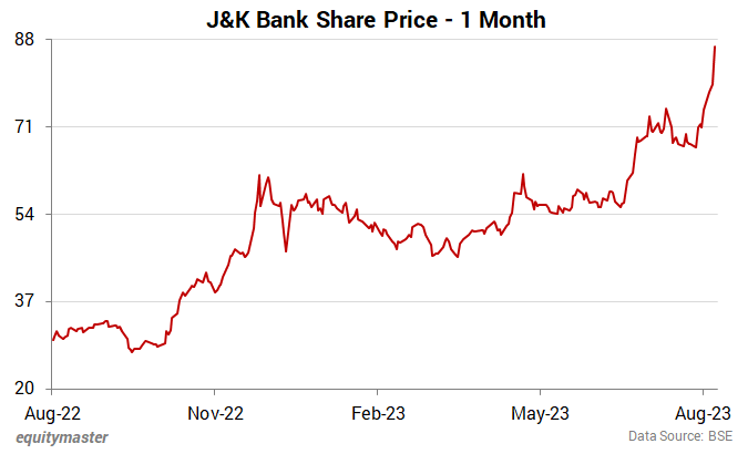 The share price of J&K Bank have surged over 21% in the past week. While over the month they are trading higher by 34%.