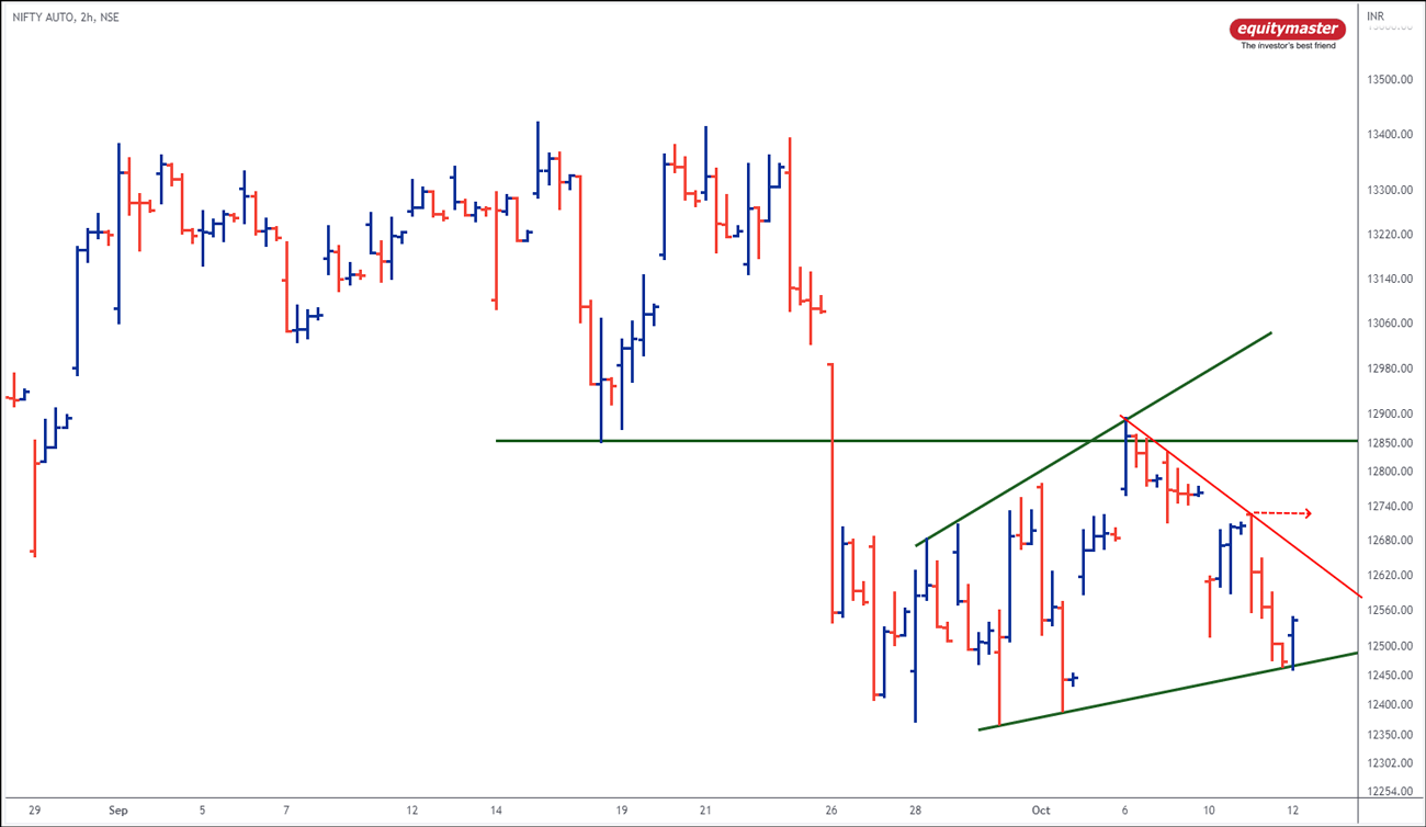 On the 2-hour chart, the auto index is trading in a rising megaphone pattern.
