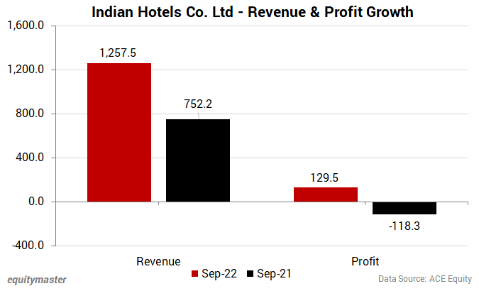 Tata Group's hospitality arm Indian Hotels Company Ltd posted a record profit of Rs 1.3 bn in the second quarter of FY23 compared to a loss of Rs 1.1 bn in the previous year. Its revenue grew to Rs 12.5 bn, a 67% growth year-on-year.