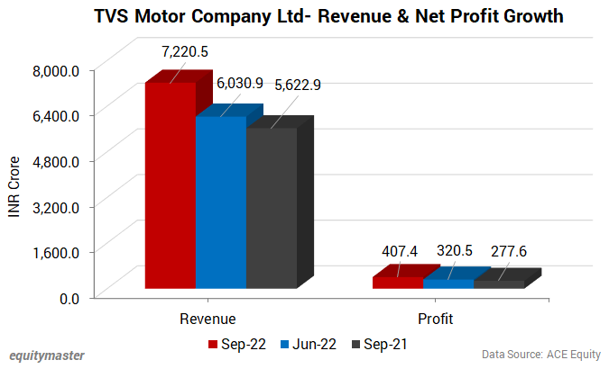 TVS Motor Company witnessed a standalone net profit of Rs 4.1 bn in the quarter ending September 30 2022 compared to a profit of Rs 2.7 bn, registering a growth of 46.7% YoY. Q2 PAT also climbed by 27.1% from Rs 3.2 bn in the preceding quarter.