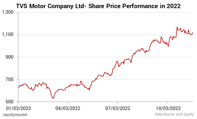 Shares of the company are trading close to their 52-week high of Rs 1,177. The stock price of the two and three-wheeler company has zoomed 116% from its low of Rs 513, that it had touched on 7 March 2022.