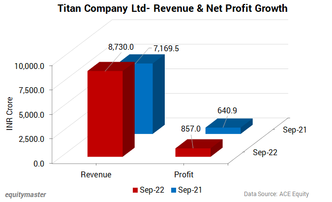 Titan reported a 22% rise in revenue to Rs 87.3 bn in the September 2022 quarter against Rs 71.6 bn in the year earlier. Net Profit for the same period was up 34% to Rs 8.5 bn as compared to Rs 6.4 bn YoY.