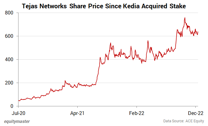 Initially, Vijay Kedia had only bought 0.81% equity in Tejas Networks in July 2020. The deal at that time was valued at Rs 37 m. The shares were acquired at a price that was a steal when it was trading at around Rs 49 per share.