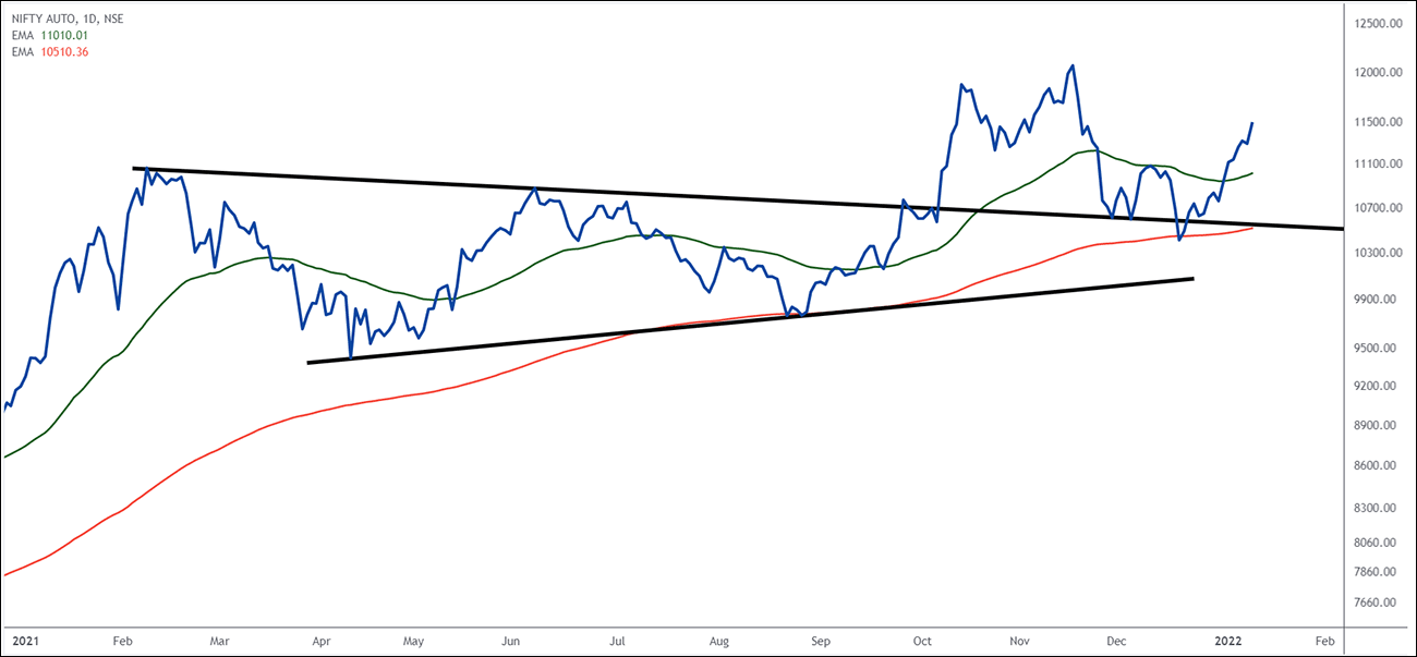 Let's look at the chart over here. This is the auto index chart, and if you look at it, it consolidated in a form of a triangle structure for a long, long time. It broke out in October 2021, went higher, re-tested the breakout level, forming the double bottom structure.