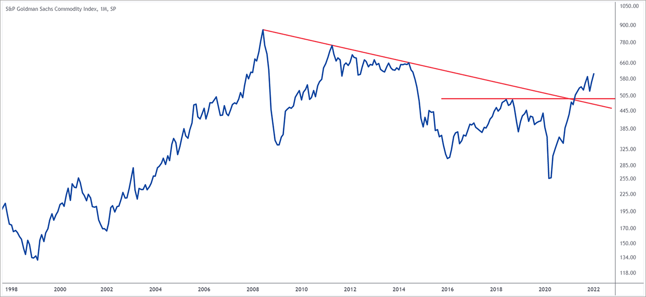 If you look at the structure over here, since 2008 when the fall started, it was foaming lower high, lower low structure like we saw in the Thomson Reuters Commodity Index and in 2021, for the first time, it broke the lower high lower low structure over here. This is very much exciting for me because they, two widely tracked commodity indices, both are breaking out of very, very crucial lower high, lower low structure and we might see the rally coming into the commodities space.