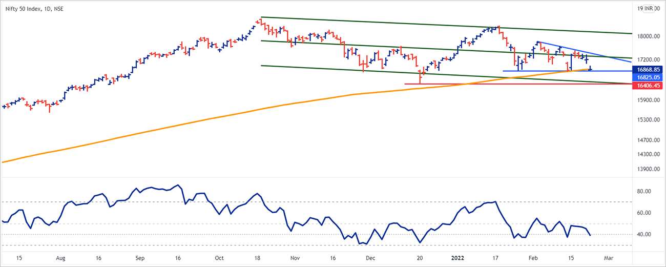 If you look at the same chart with the RSI, which is generally shows the strength of the momentum, again, this is the daily RSI. Generally, when the RSI falls between 40 to 30, Nifty tends to see a positive momentum. Again the support will play a key, important role over here. But looking at the momentum this week, we again yesterday hit a low of 16,800 which has been acting as a huge support zone for now.