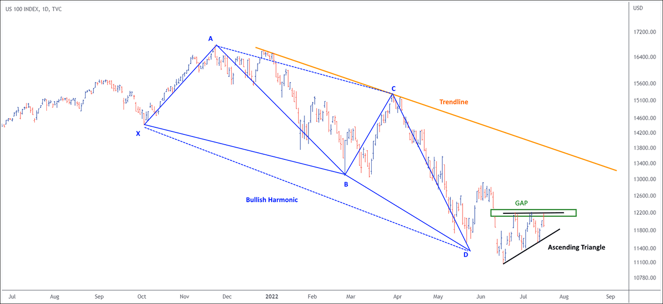 Plus if you see the trendline over here, I believe once the ascending triangle and gap area is taken out, the NASDAQ might go higher to test the trendline, which is placed at around 13,350-13,400 levels on the upside.