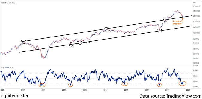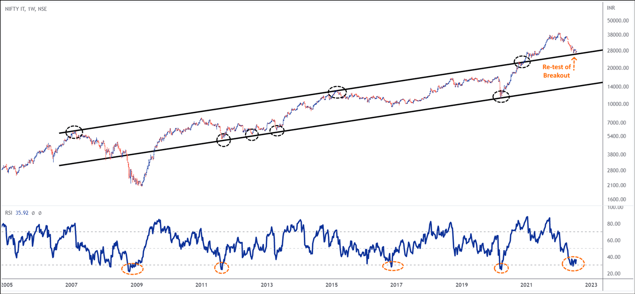 The second chart. If I just move to the Indian IT index chart, this is the weekly chart of the CNX IT or Nifty IT, and if we look at the rising channel, we saw a break out. The breakout has been re-tested if look at the orange marks over there.