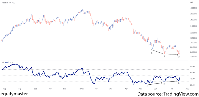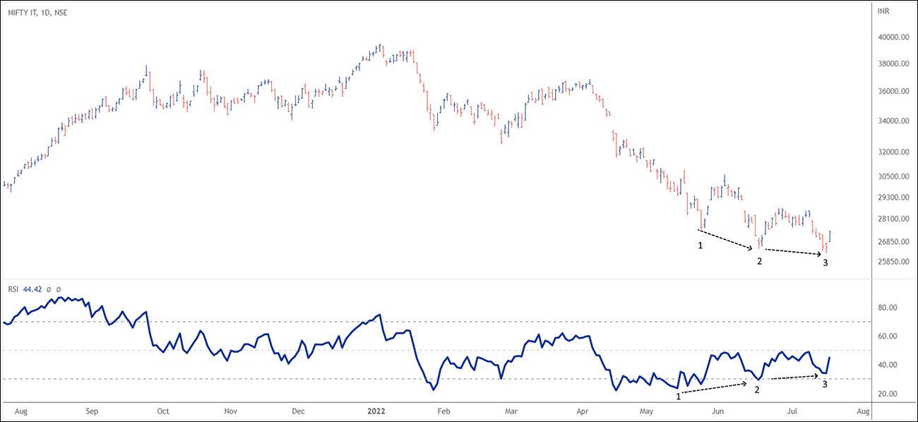We are witnessing triple bullish divergence or triple positive divergence on RSI. So if you look at the markings over here, 1, 2, and 3, the prices on the above chart, if you look at 1 to 2, the prices made a new low. 2 to 3, prices again made a new low. But if you look at the lower panel, which is the RSI, prices here are making the higher lows.