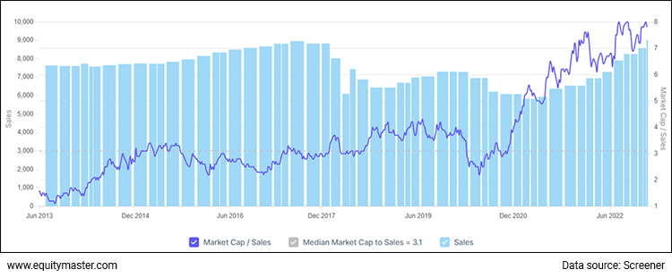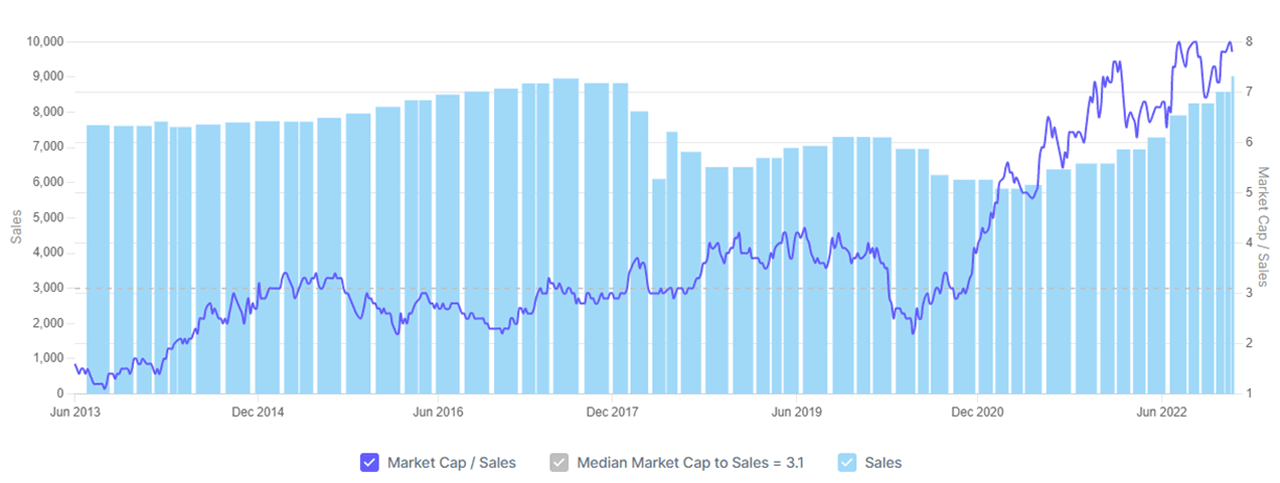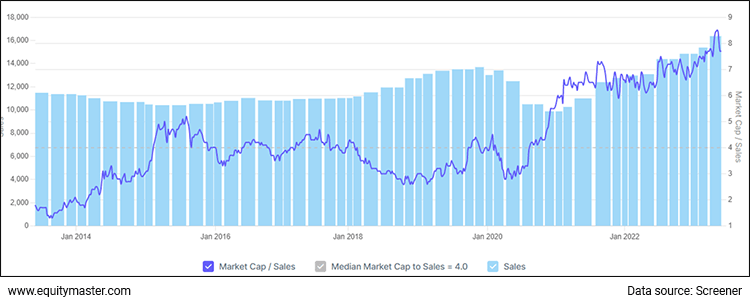The market capitalisation to sales ratio of ABB Limited is roughly 8 times while the median has been 3 times.