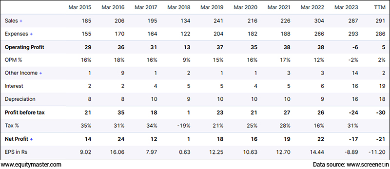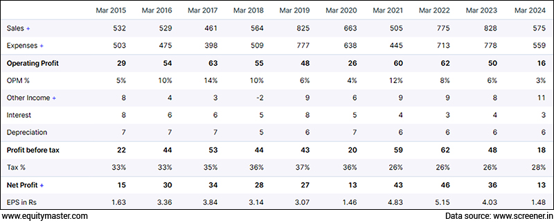These are the financials of a penny stocks for the last 10 years. I define a penny stock as a stock that's trading at a 2-digit price. In other words, a stock that is trading at less than Rs 100.