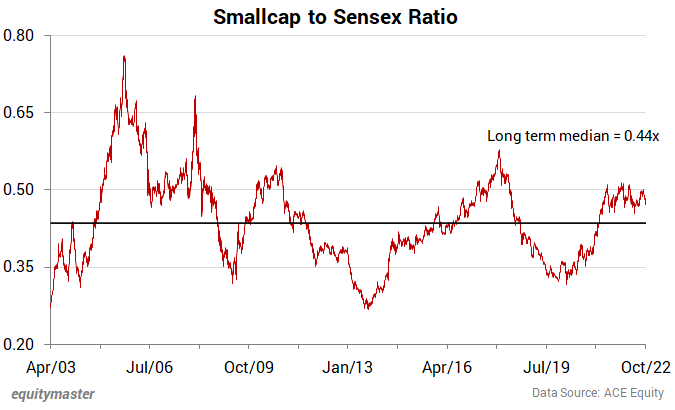 The smallcap to Sensex ratio is higher than the long-term median of 0.44 times, yet way below the previous peaks.
